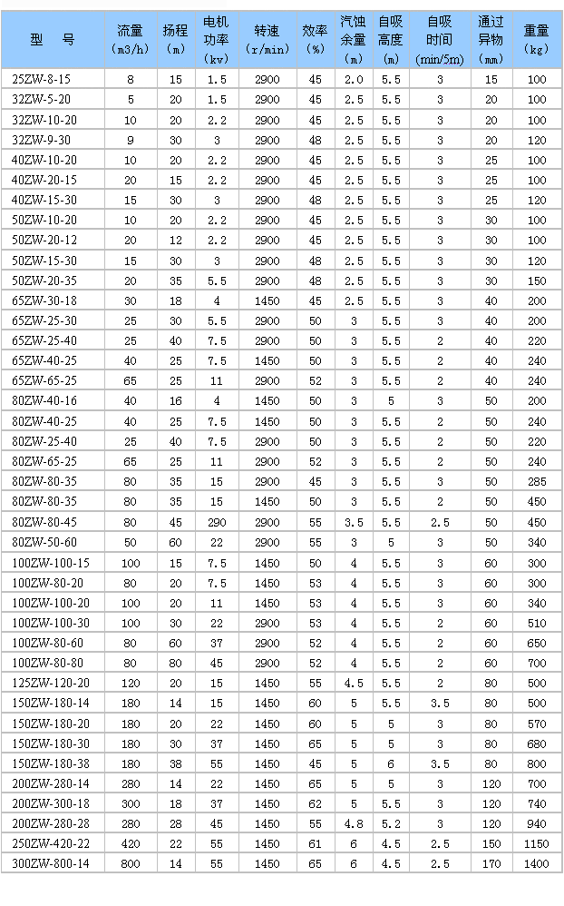 六、ZW型自吸式無堵塞排污泵性能參數(shù):