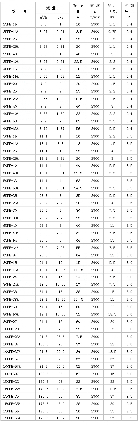 四、FB、AFB型耐腐蝕離心泵性能參數(shù):