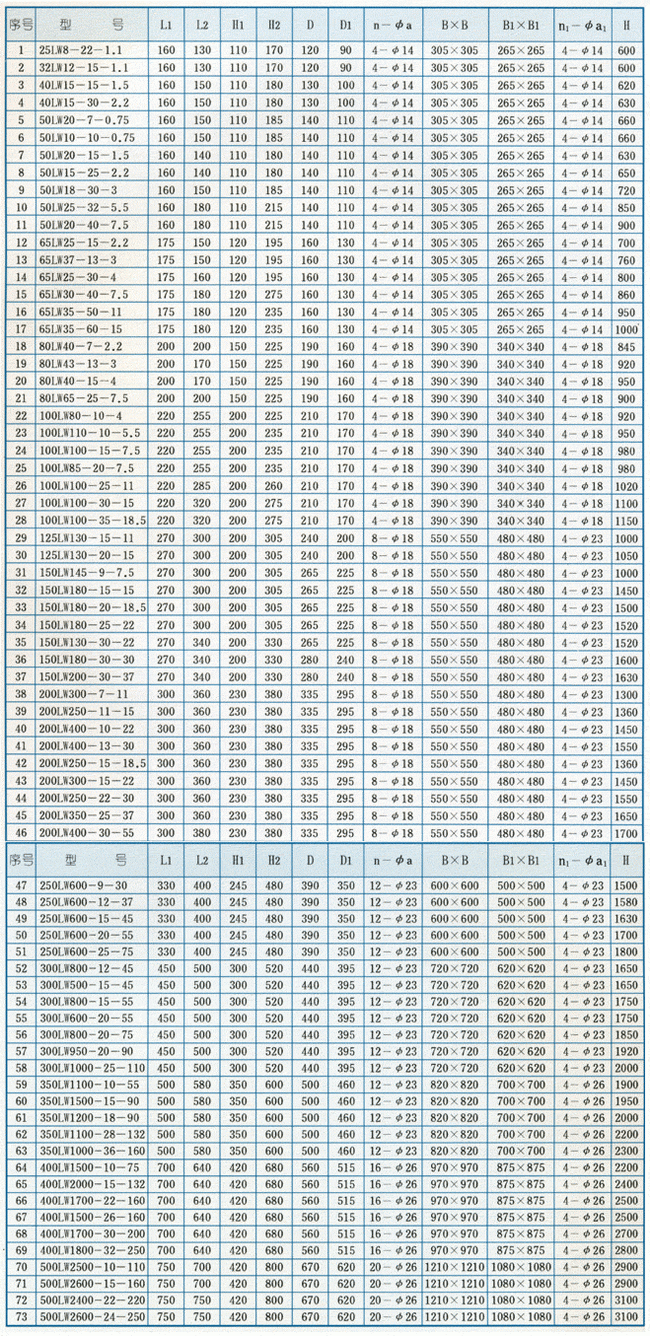 LW型直立式無堵塞排污泵外形安裝尺寸表: