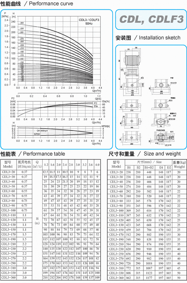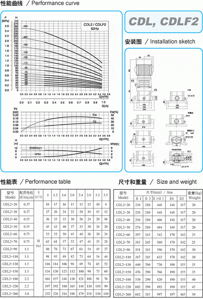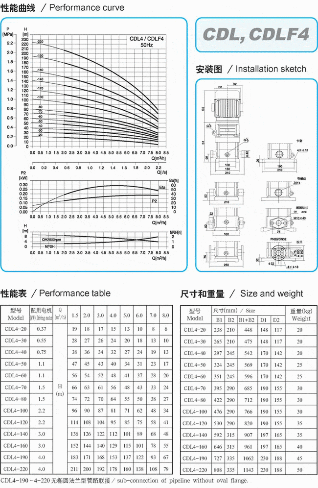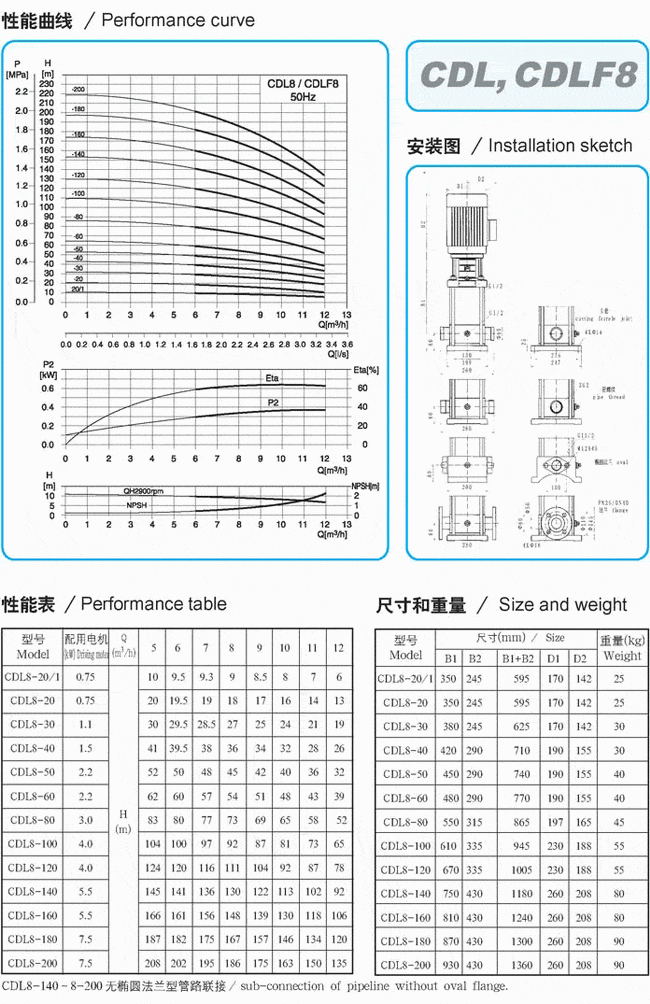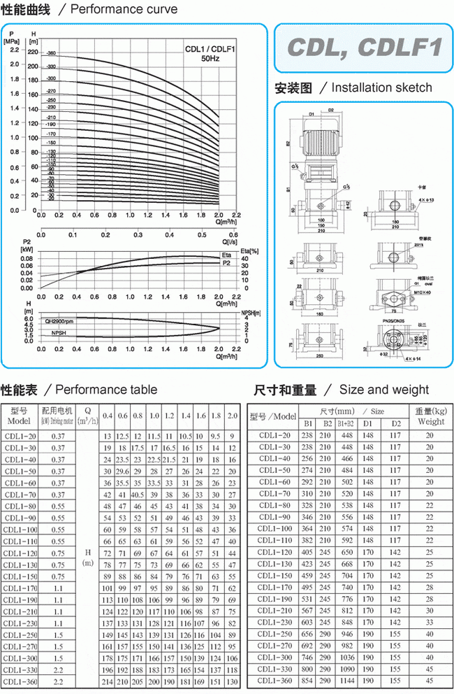 CDLF系列輕型不銹鋼立式多級泵性能參數表(1)