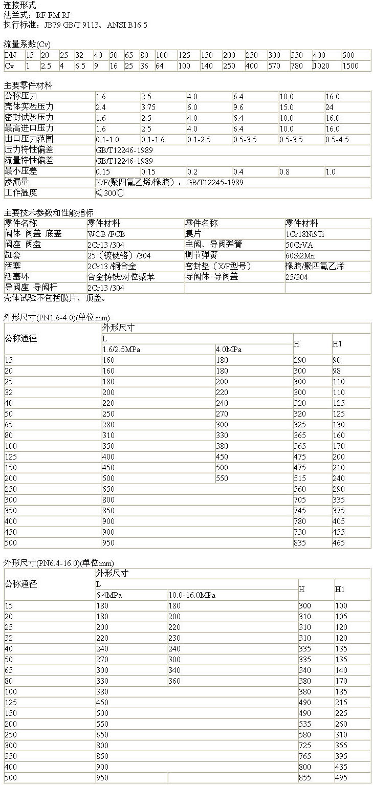 產(chǎn)品型號 公稱壓力 公稱通徑 鏈接法蘭標準 進口壓力 額定流量 系數(shù)Cv 調節(jié)范圍 工作介質和介質溫度