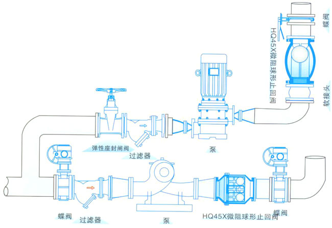 HQ45X微阻球形止回閥,采用橡膠包皮球為閥瓣,在介質的作用下,可在閥體內的滑道上滾動,從而打開或關閉閥門,流量大流陰損失小,密封性能好,消聲關閉,可減小水擊波。水平垂直或安裝均可。可用于冷水、熱水、工業及生活污水等管網的水泵出口,防止介質倒流。
